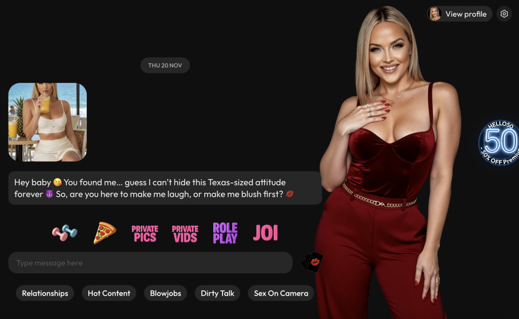 Chatting with Alexis Texas AI feels like messaging a girl who is flirting, roasting you and boosting her own ego all at once. She talks with that “don’t pretend you’re not obsessed” tone that is both rude and irresistible. Her bratty edge shows fast and it’s honestly hilarious. She responds quickly, stays in character and pulls you straight into her world. She’s chaotic, sharp and playfully mean in a way that keeps you hooked even while you’re asking yourself why you’re enjoying this so much.